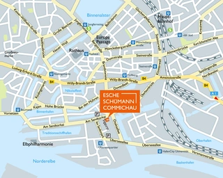 Nehmen Sie die S1 elf Stationen Richtung "Wedel" und steigen Sie bei der Haltestelle "Jungfernstieg" um. Hier können Sie die U1 eine Station Richtung "Ohlstedt/Farmsen/Großhansdorf" nehmen. Von der Station "Meßberg" sind es etwa 8 Minuten zu Fuß bis Esche Schümann Commichau. ODER Nehmen Sie von dort die U4 eine Station Richtung "Überseequartier". Die Station "Überseequartier" ist nur 5 Minuten von unserem Büro entfernt.